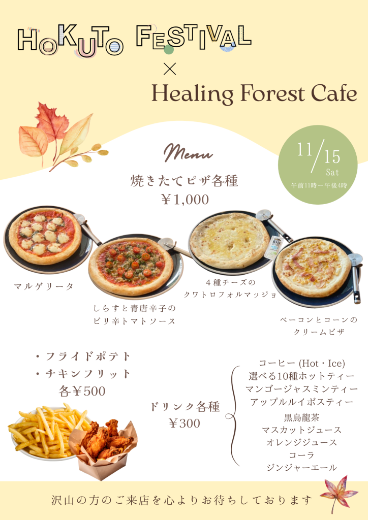 11月15日(土)に開催します北斗フェスにてHealing Forest Cafeは特別営業をさせていただきます! 焼きたてのピザや種類豊富なドリンクを準備してお待ちしております。