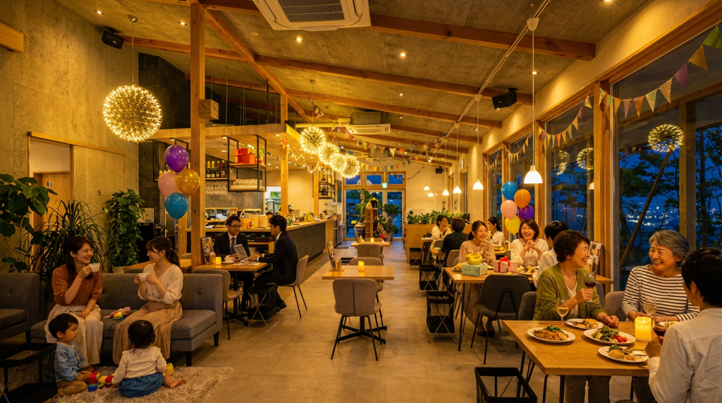「子ども連れでも安心な場所でゆっくり話したい」「レストランほど堅くなく、居酒屋ほど騒がしくない場所がいい」そんな”ちょうどいい会場”として多くの方にお選びいただいています。森をテーマにした癒しの空間が、いつもの集まりを特別なものにしてくれます。
